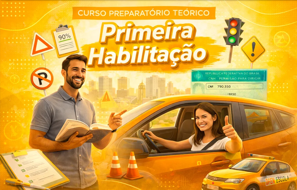 O curso prepara o candidato para a prova teórica da CNH, abordando legislação de trânsito, direção defensiva, primeiros socorros, meio ambiente, cidadania e noções de mecânica, formando condutores mais seguros e conscientes.